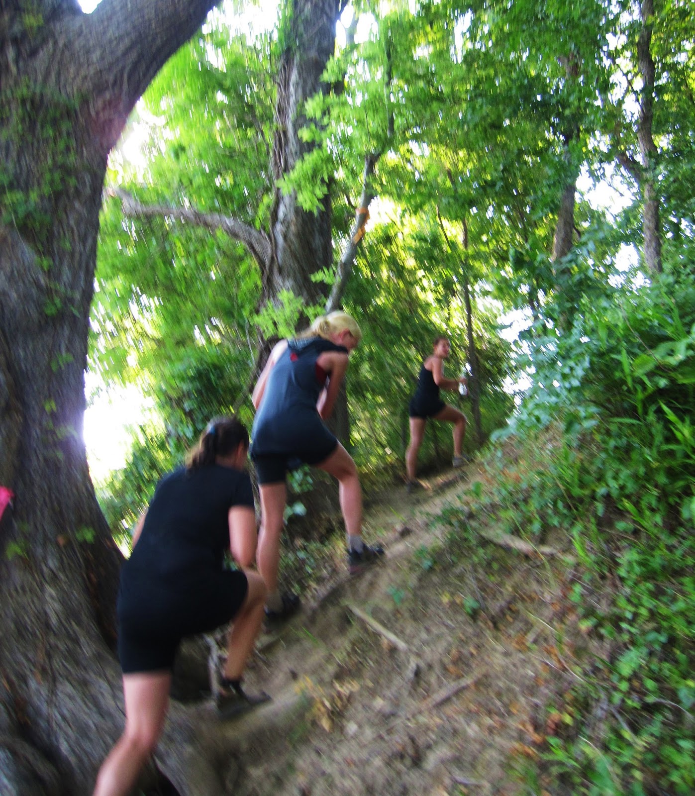 DJ scrambles up a 30 foot climb with the help of ropes.