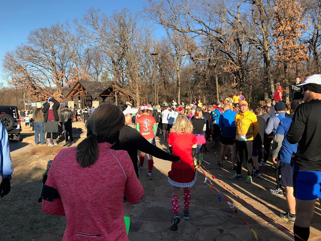 The race start had temps in the 30s, but with no wind and bright blue skies it warmed up and I took a short break to shed my long sleeves. At the end of the Ridge trail, the course crosses over the Powerline Trail to the west side. I was enjoying a nice downhill when I almost ran over a friend--Randy Brinkley, who had taken a fall. I asked if he was OK, and he popped back up and was fine. We ran together for a half mile or so, then I passed him and tried to catch up with the Vinita girls. But then I caught up with Lynna, and we ran together for the next several miles.